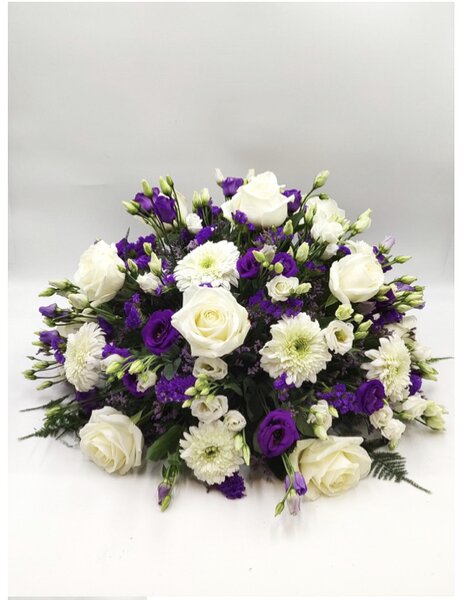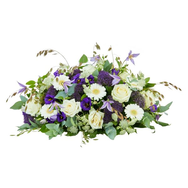 De rouwarrangementen kunnen in diverse kleuren en maten geleverd worden. Compact of juist uitbundig gestoken